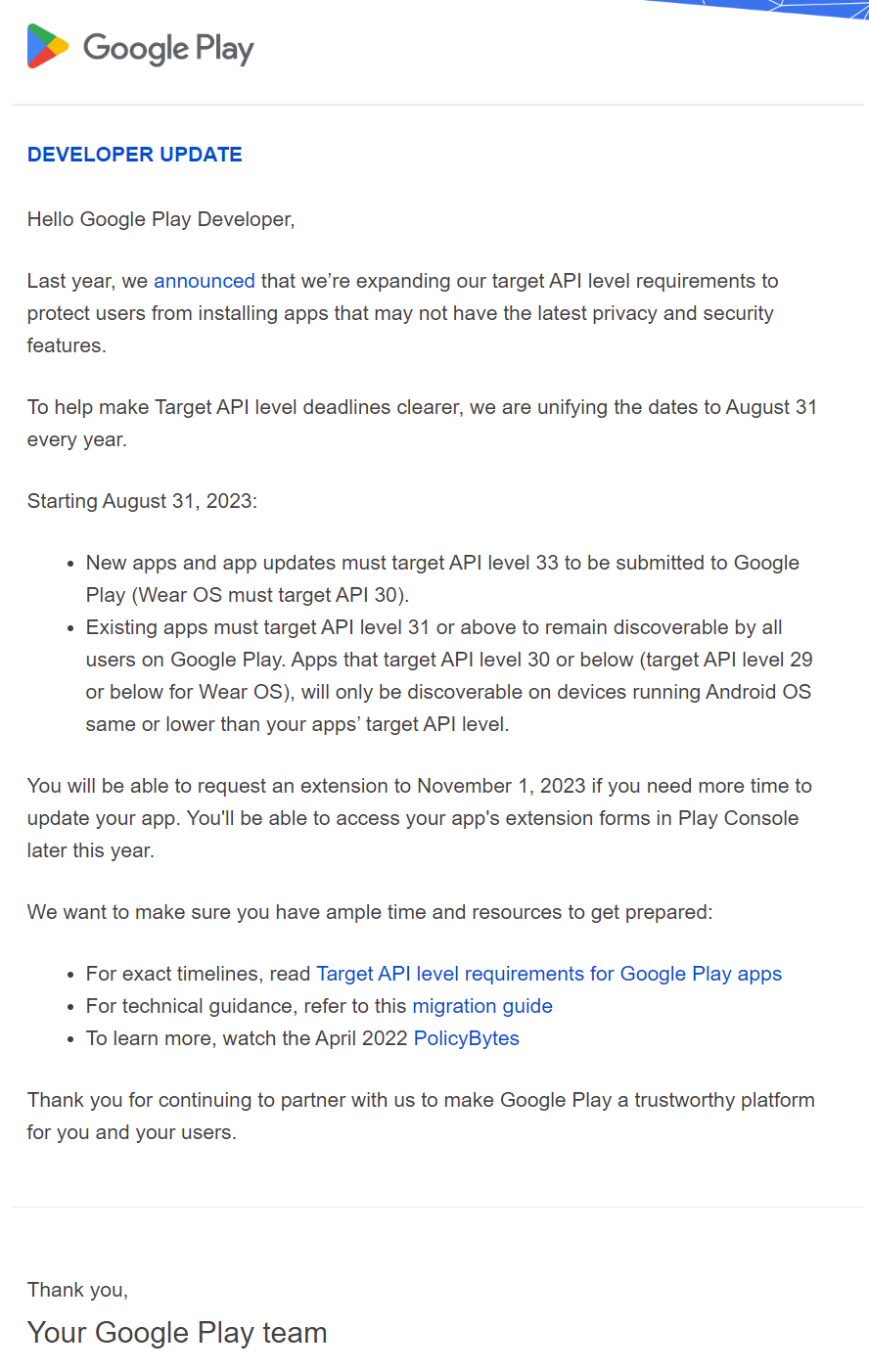 - 2023년 8월 31일 부터 Google Play 에 등록되는 모든 앱들은 Target API Leve 을 33 이상으로 설정해야 합니다.