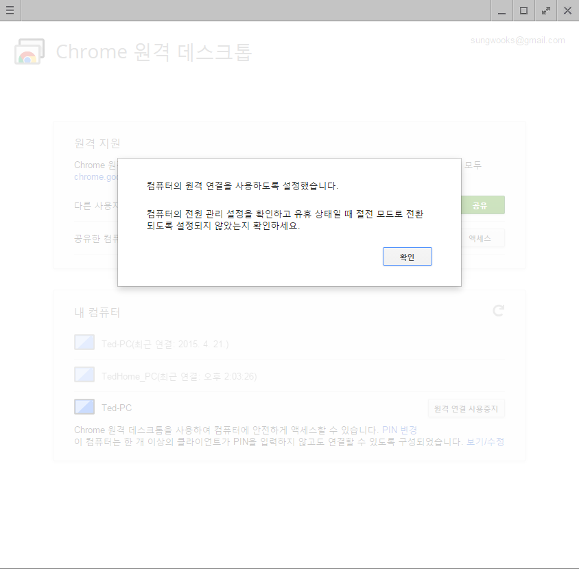 하단에 ‘원격연결 사용’버튼이 ‘원격 연결 사용중지’ 로 바뀌었죠?