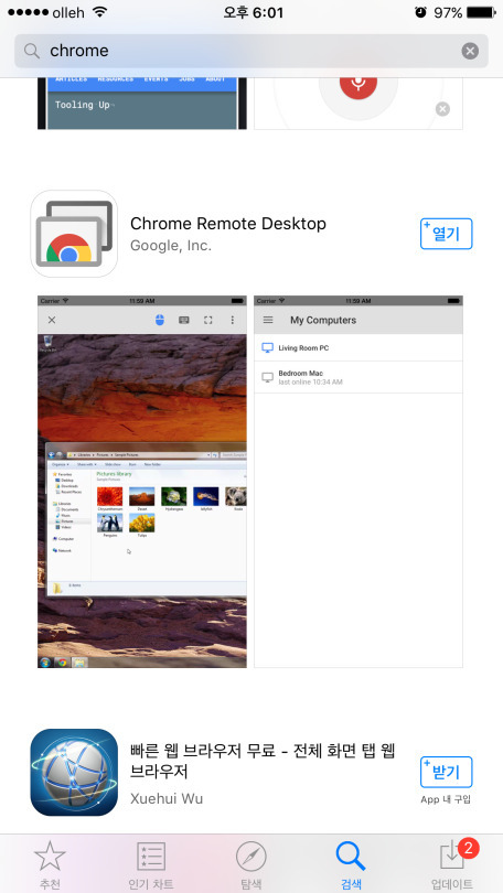 검색 : chrome 으로 검색합니다. 조금 내려보면 Chrome Remote Desktop 이 보입니다.