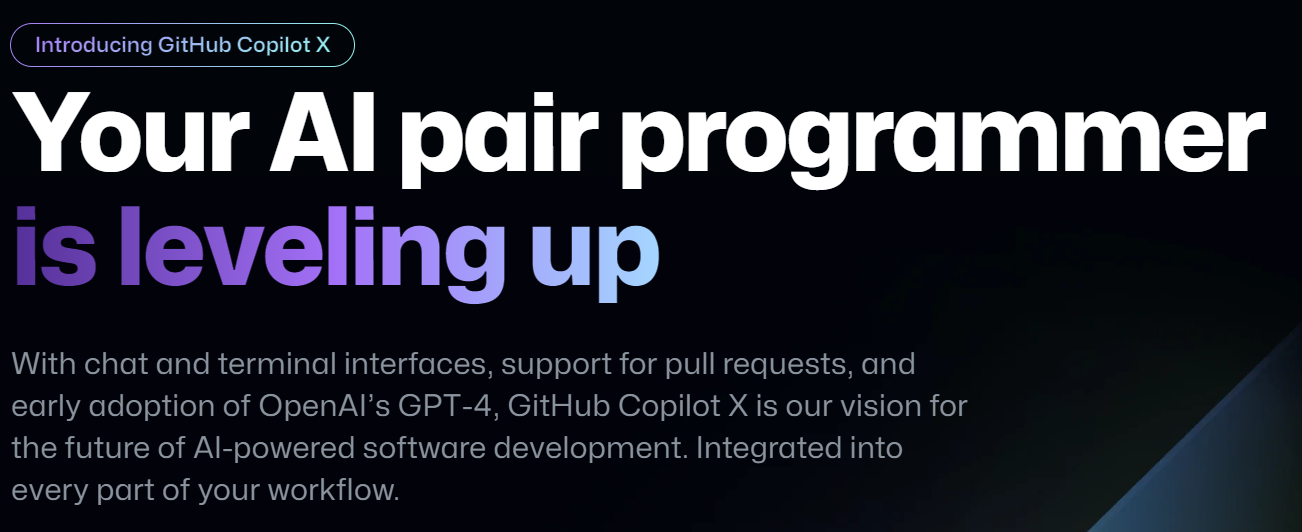 Github 에서 2021년에 출시했던 자동 코드 완성 AI 인 Copilot에 ChatGPT-4 모델이 적용되었습니다. https://github.com/features/preview/copilot-x Introducing GitHub Copilot X GitHub Copilot X is our vision for the future of AI-powered software development. github.com 현재 Chat, Voice, PRs, Docs, CLI 의 5가지 기능으로 나뉘어 있습니다. Copilot Chat 은 월 10달러의 요금이 부과 되며 나머지 기능은 베타 형식으로 대기자 목록에 등록해두고 차례가 오면 사용 권한을 얻을 수 있습니다. (대기자 목록 등록은 각각의 링크에서 모..