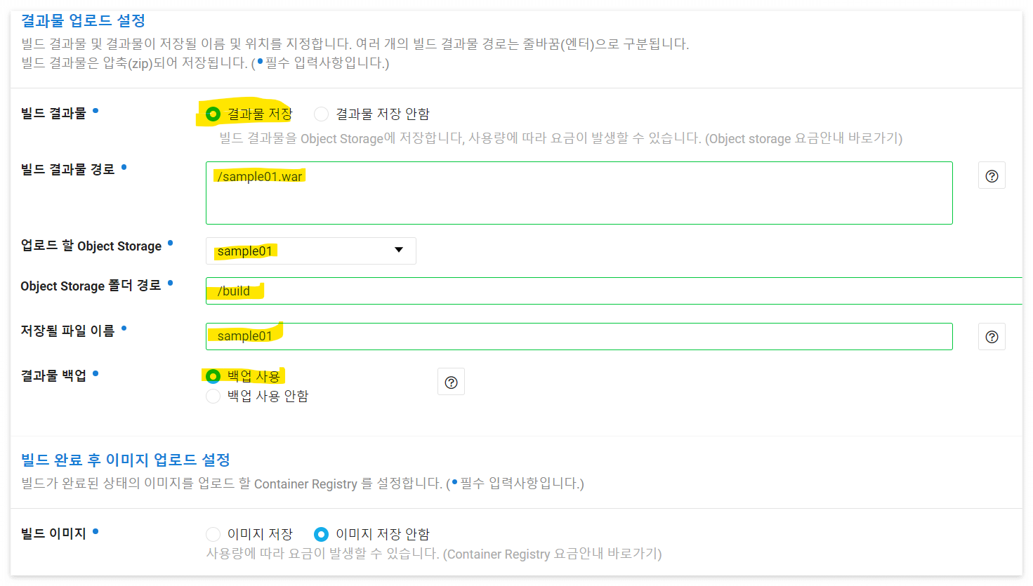 - 빌드 결과물 : 결과물을 Object Storage 에 저장합니다. (빌드 한 파일 저장이 필요 없다면 생략 가능)