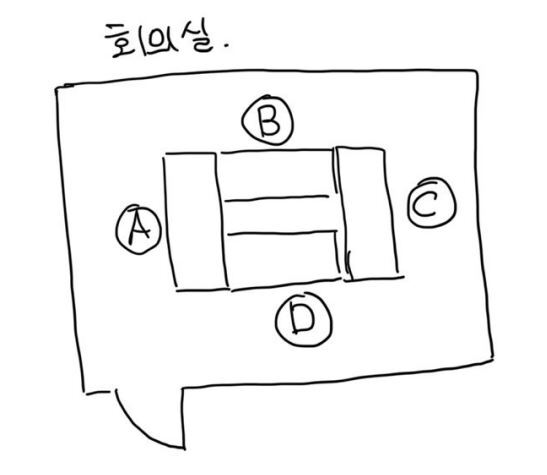 A와 C의 뒤쪽은 벽이고 D 쪽은 출입구, B 쪽에는 창문이 있습니다.